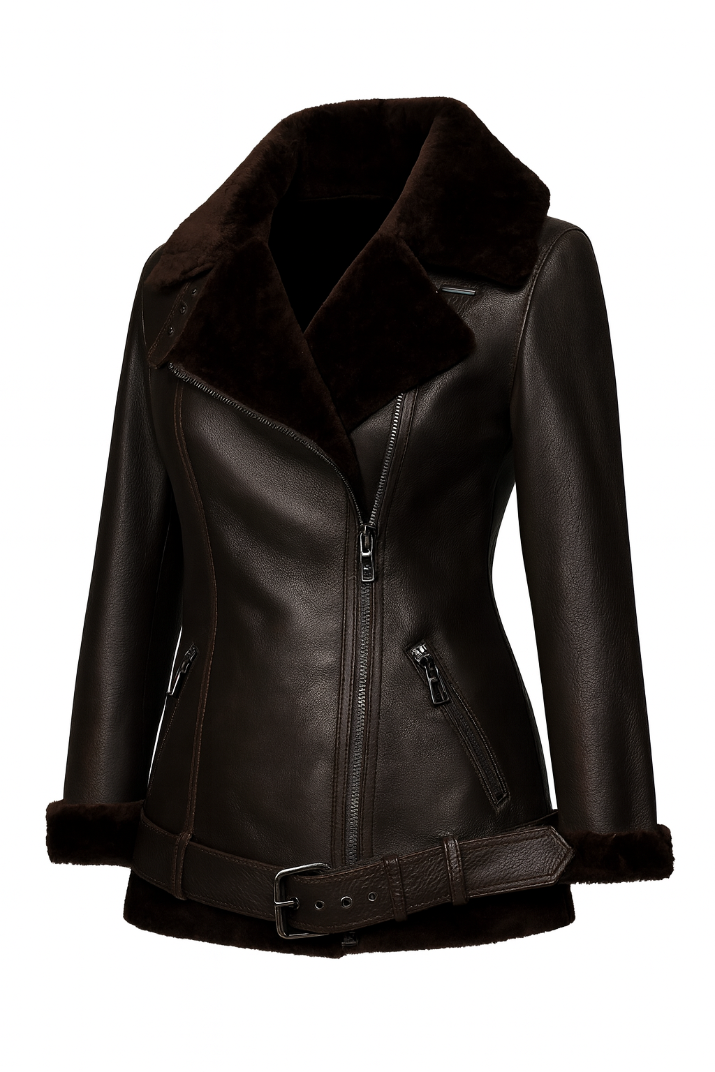 Der voluminöse Lammfellkragen, die charakteristische Biker-Silhouette und die markanten Zipperdetails verleihen der Jacke ein exklusives und zugleich modernes Erscheinungsbild. Die taillierte Passform betont die Figur, ohne die Bewegungsfreiheit einzuschränken.